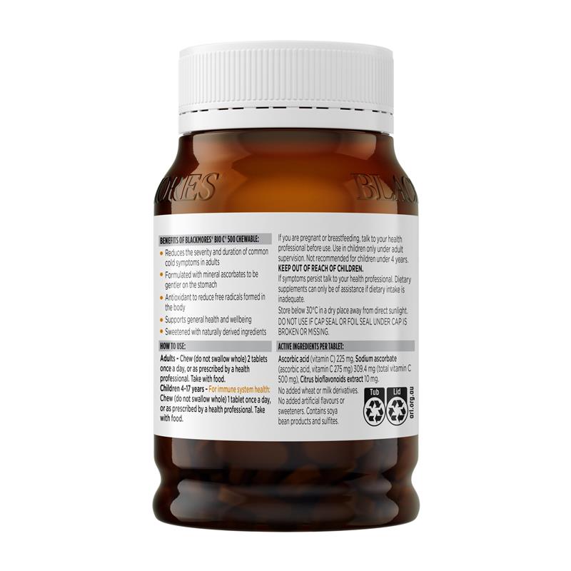 Shorten the duration of the common cold with Blackmores Bio C® 500 Chewable tablets. This great-tasting orange-flavoured vitamin C supplement supports your immune system health. It’s sweetened with naturally derived ingredients and buffered with mineral ascorbates to make it gentler on your stomach. This formula includes Vitamin C and bioflavonoids that work together to support the activity of Vitamin C. Adults should chew (do not swallow whole) two tablets once a day for a cold, or just one tablet for general immune system health.