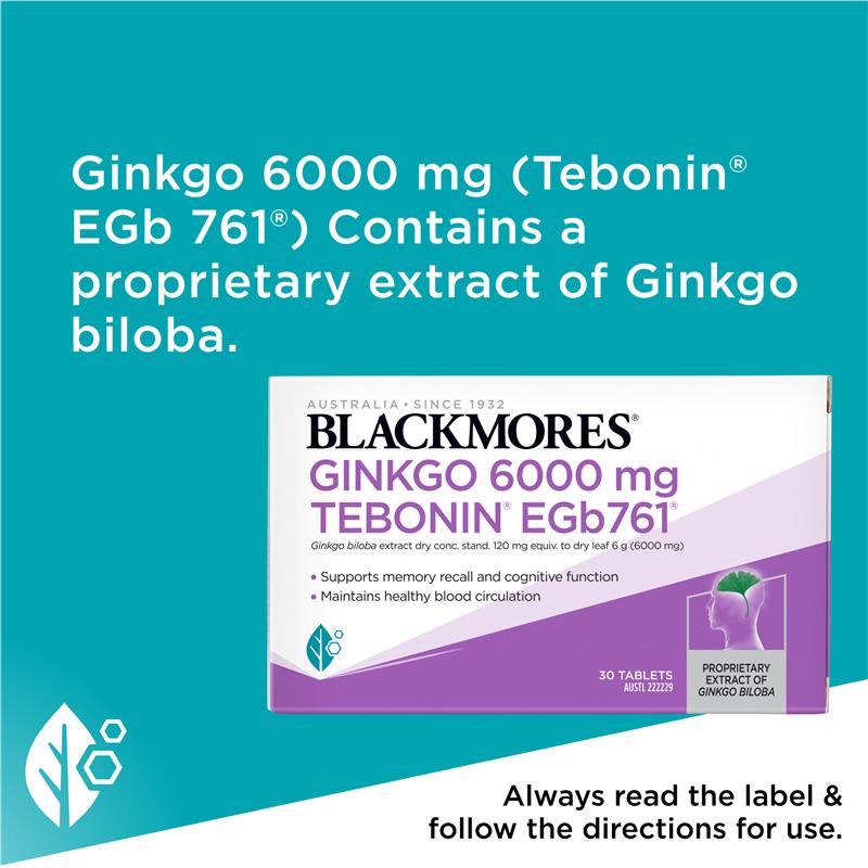 Blackmores Ginkgo 6000 mg (Tebonin® EGb 761®) helps support memory and cognition. It is also an antioxidant and maintains healthy blood circulation.
