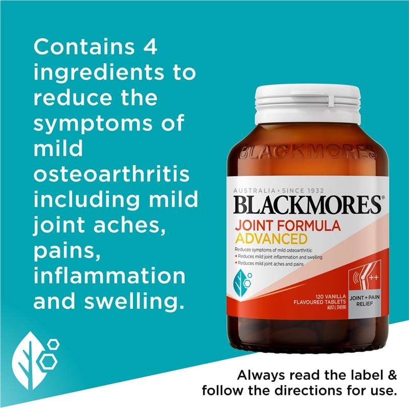 mild osteoarthritis. Get the mild joint pain relief you need with Blackmores Joint Formula Advanced. Adults: Take 1 tablet 2 times a day tablets a day to support healthy cartilage, joints and bones. Suitable For: Adults Only or as professionally prescribed