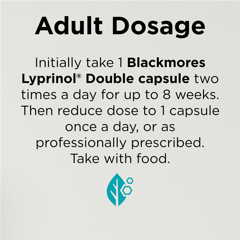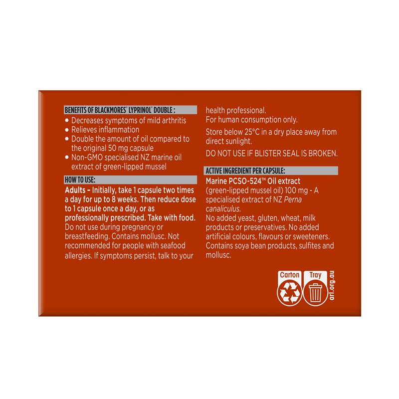 Need relief from the symptoms of mild osteoarthritis and inflammation? Experience the anti-inflammatory benefits of Blackmores Lyprinol® Double capsules. This product contains twice the specialised marine green lipped mussel oil extract, compared to the original Lyprinol® 50mg capsule, so you can take fewer capsules. Support your general well-being,  Suitable For: Adults Only.