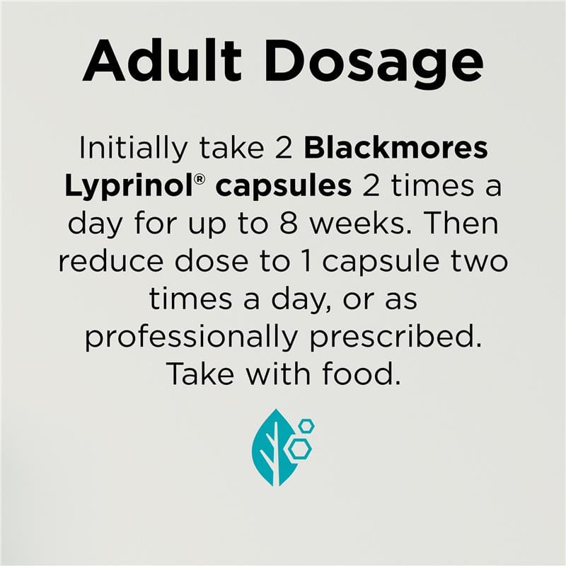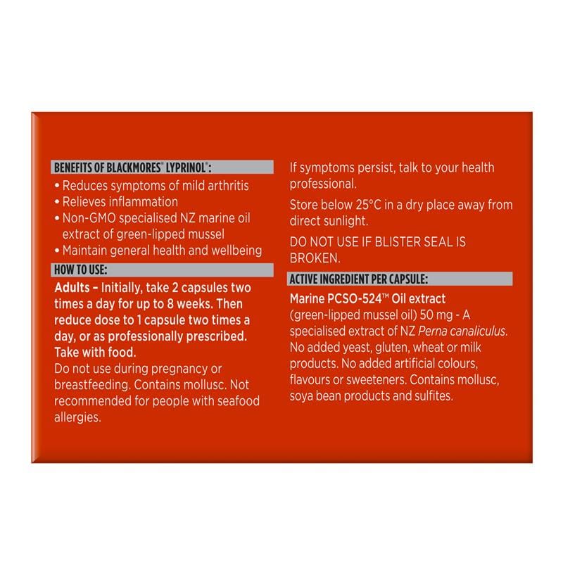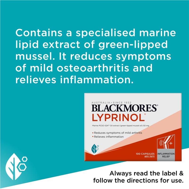 Get relief from the symptoms of mild osteoarthritis with Blackmores Lyprinol® capsules. This product contains a specialised marine lipid extract of green-lipped mussel. This marine oil extract also has an antiinflammatory action to give you the relief you need. Adults: Initially, take 2 capsules two times a day for up to 8 weeks. Then reduce dose to 1 capsule two times a day, or as professionally prescribed. Suitable For: Adults only.