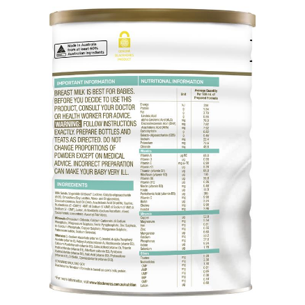 Blackmores số 1 được pha trộn độc đáo với các thành phần chứa 25 chất dinh dưỡng bao gồm các Vitamin và khoáng chất thiết yếu cộng với hệ dưỡng chất Prebiotic được chứng minh là cần thiết cho trẻ sơ sinh giai đoạn từ 0-6 tháng.