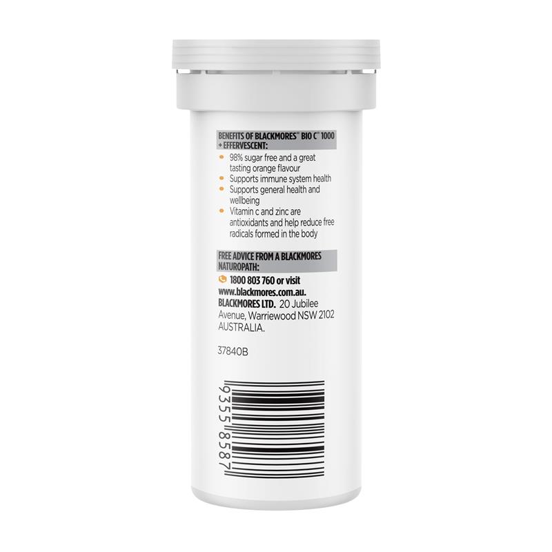Blackmores Bio C® 1000 + Effervescent is a 98% sugar free formula with echinacea, Zinc and a boost of viamin C to support immune system health and reduce the severity and duration of common cold symptoms.