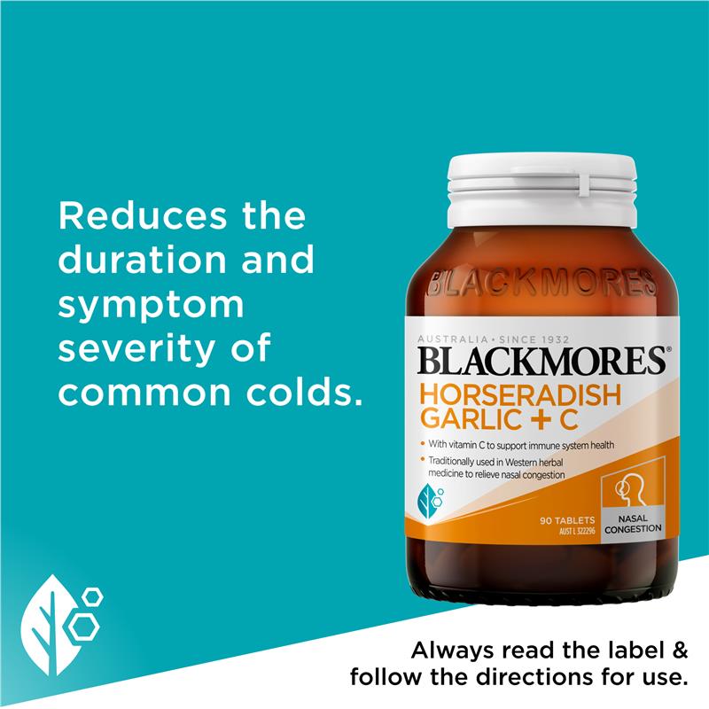 Blackmores Horseradish Garlic + C is a combination formula that reduces the duration and symptom severity of common colds and supports general health and wellbeing.