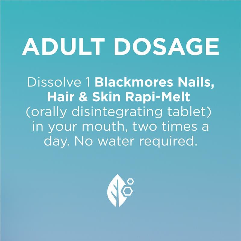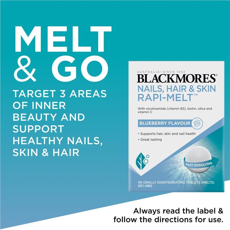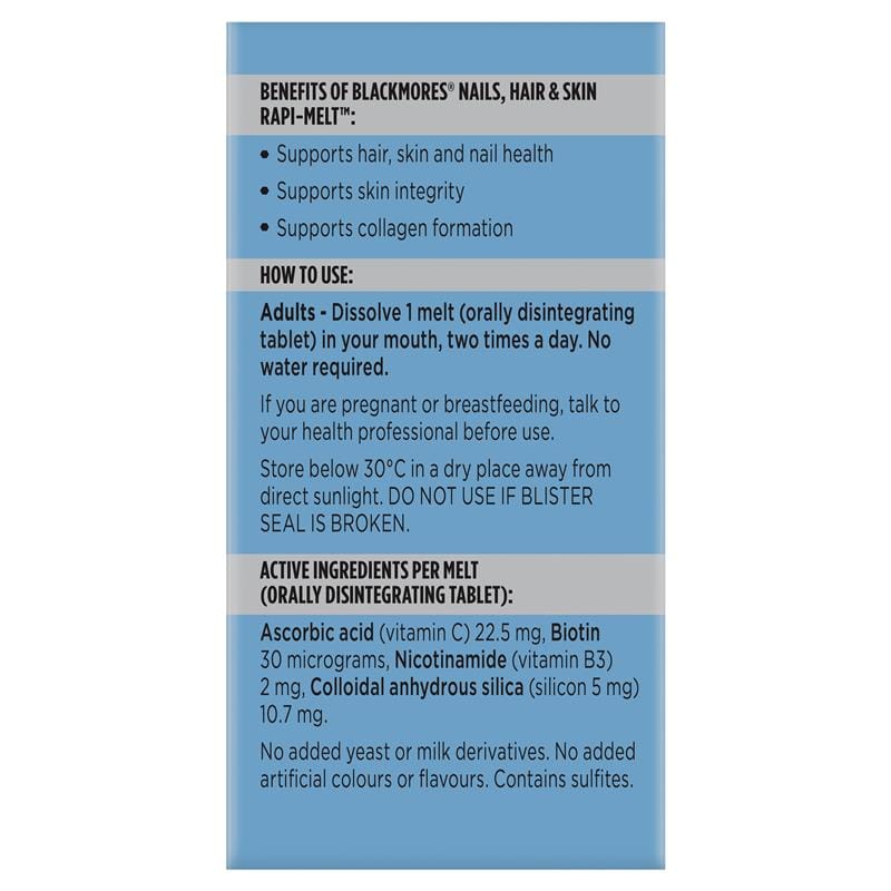 Blackmores Nails, Hair & Skin Rapi-Melt™ is a fast dissolving and great tasting blueberry flavoured melt which supports hair, skin and nail health, skin integrity and collagen formation. Supporting on-the-go wellness, no water required. Suitable For: Adults only.