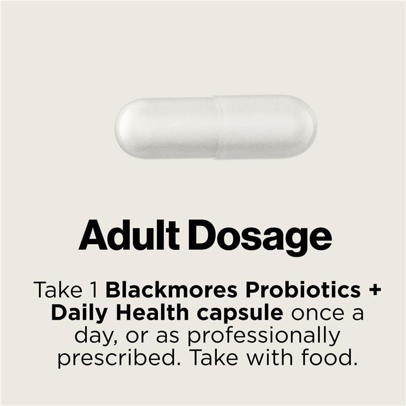 Support your gut health with Blackmores Probiotics+ Daily Health capsules. This product combines a daily probiotic formula with a prebiotic to maintain your intestinal health and relieve digestive discomfort. This dualaction formula contains five clinically trialled* probiotic strains providing 30 billion good bacteria. There’s no need to refrigerate – a specialised formulation process and packaging technology help prevent moisture from harming the good bacteria, helping keep them alive. Adults: Take one capsule per day to nourish good intestinal flora and support your intestinal health Suitable For: Adults take 1 capsule once a day or as professionally prescribed