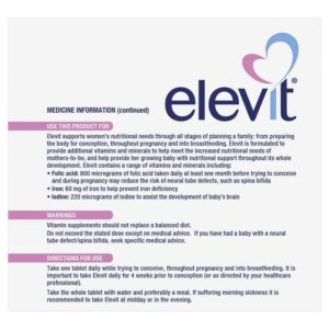 Take one tablet daily while trying to conceive, throughout pregnancy and into breastfeeding. It is important to take Elevit daily for 4 weeks prior to conception (or as directed by your healthcare professional). Take the whole tablet with water and preferably a meal. If suffering from morning sickness it is recommended to take Elevit at midday or in the evening.