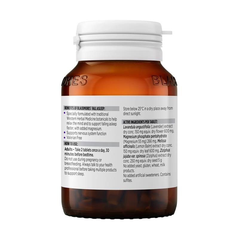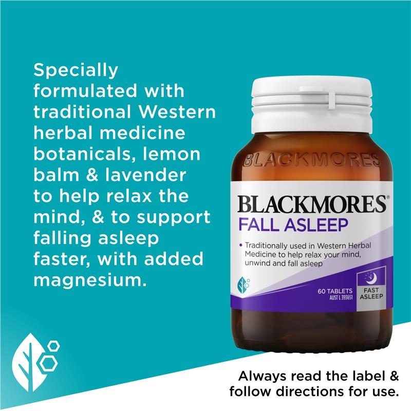 Blackmores Fall Asleep specially formulated with traditional Western herbal medicine botanicals, lemon balm and lavender to help relax the mind, and to support falling asleep faster, with added magnesium.