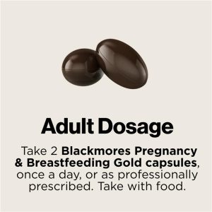 Help provide nutrients for a healthy pregnancy for mum and bub. Blackmores Pregnancy and Breast-Feeding Gold capsules are formulated to provide the nutrient requirements for pregnant and breast-feeding women. This dietary breast-feeding supplement provides 20 important nutrients for mother including folic acid, iodine and vitamin D3, with supporting nutrients for baby. It also contains omega-3 DHA to support your baby’s brain and nervous system development, and a lower constipation form of iron which is gentle on the digestive system. Adults: Take two capsules once a day. Suitable For: Adults only or as professionally prescribed
