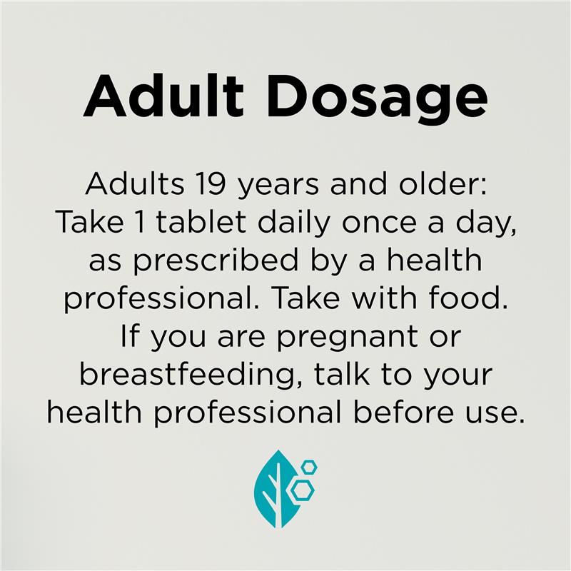 Adults 19 years and older – Take 1 tablet once a day, or as prescribed by a health professional. Take with food. Storage Temperature: Below 30°C