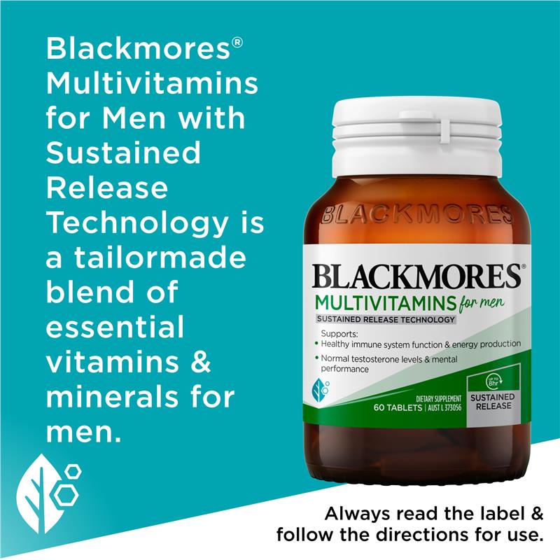 Blackmores® Multivitamins for Men with Sustained Release Technology is a tailormade blend of essential vitamins & minerals for men. It is formulated to support immune system function and energy production. This convenient one-a-day multivitamin supports testosterone levels and mental function and is designed with a unique sustained release technology that release nutrients to the body gradually throughout the day.
